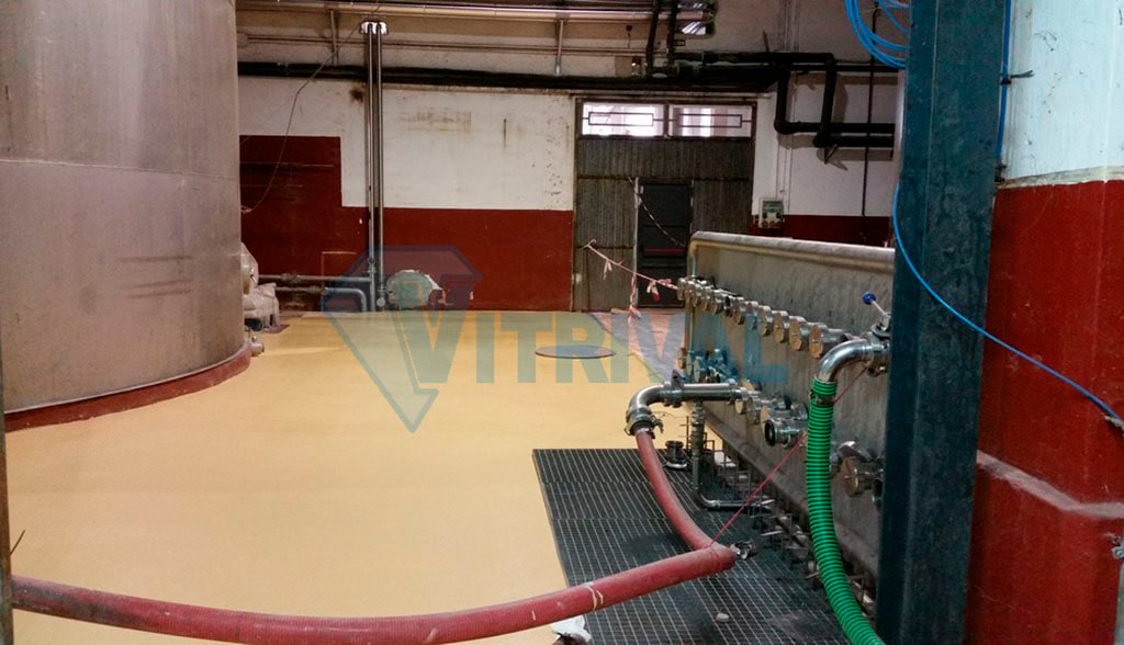 También, en la zona de vendimia, donde se recibe la uva en la bodega, realizamos un Pavimento Multicapa de Poliuretano, facilitando así la limpieza y la durabilidad del pavimento.